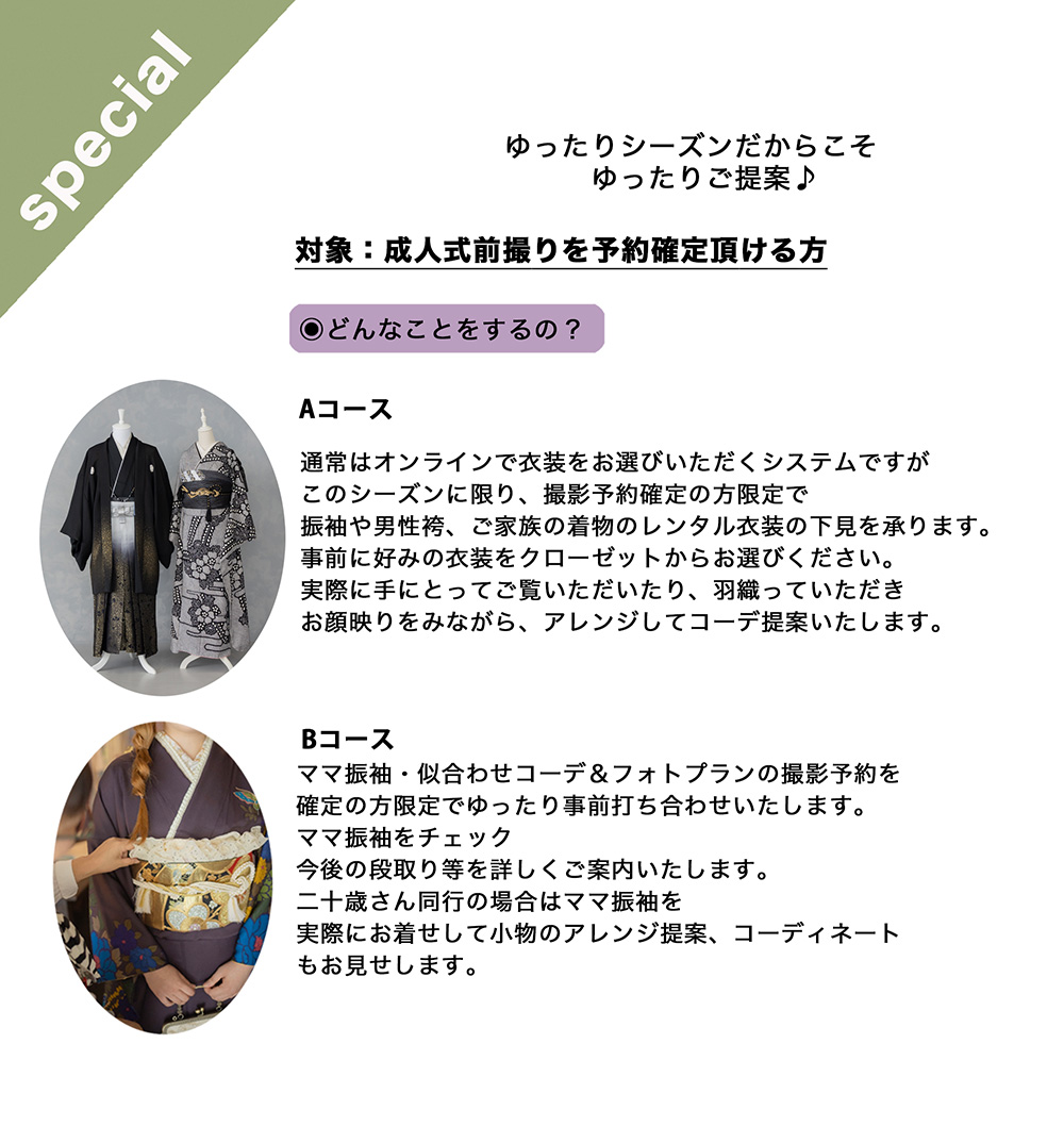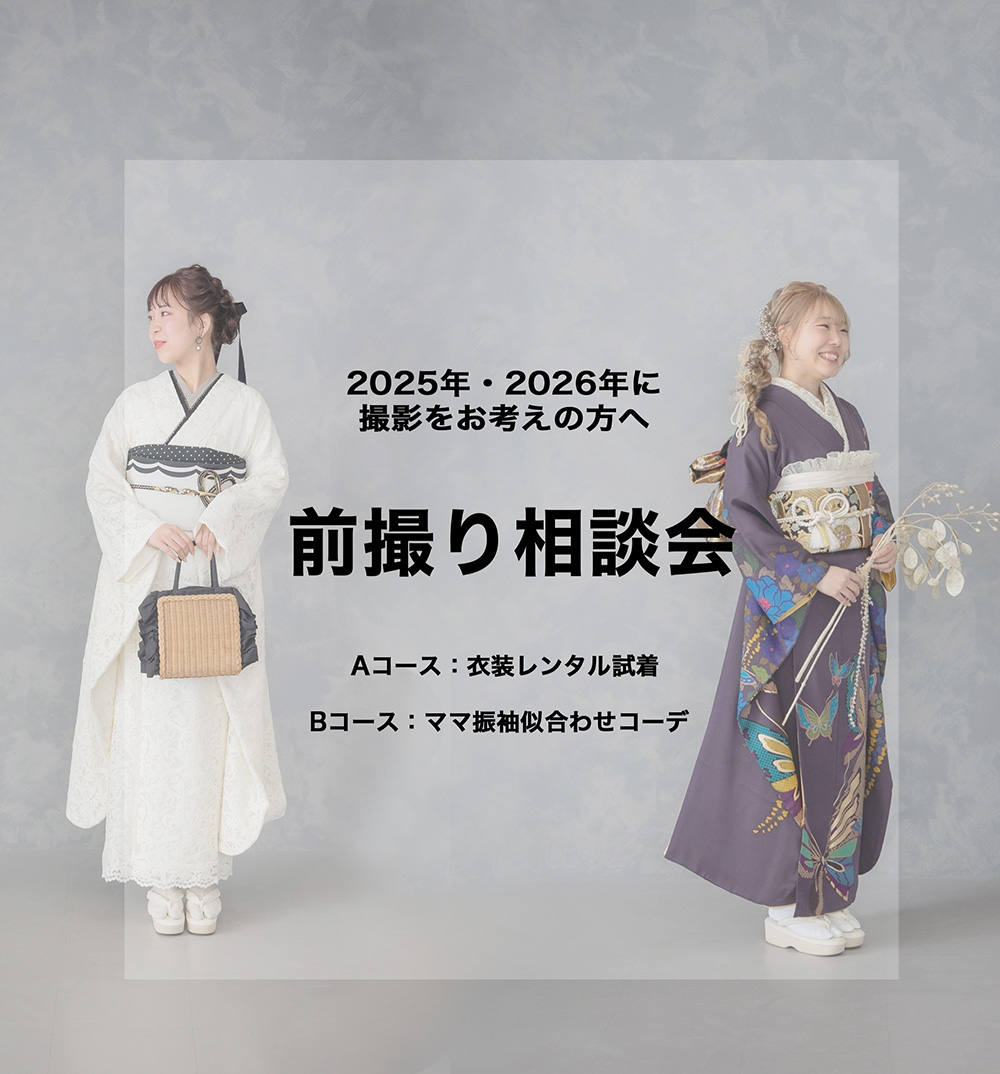 当店で成人式の前撮りをご予約いただいたお客さま限定で着物相談会を開催いたします。
