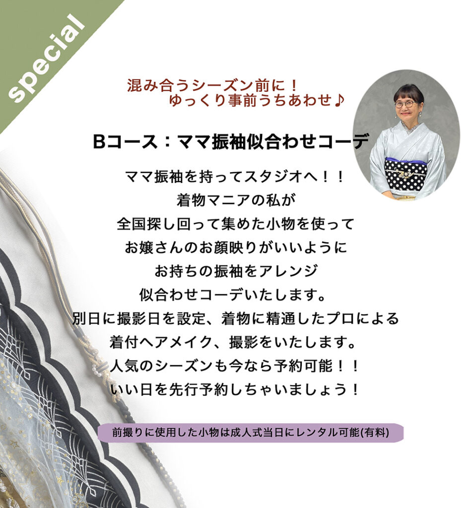 Bコース:専門家によるママ振袖似合わせコーデなどご提案するコース